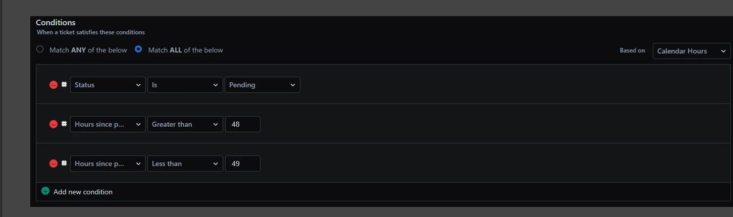 When both of these are on, at 9 hours past the agents reply and pending status being selected, the requester will get an email every hour, on the hour until 19 hours has elapsed. Then the other one will start sending emails. I have a strong belief here that the Supervisor rule, for some reason, isnt accepting two conditions for the same criteria but I’m nowhere near perfect so hoping someone else has something that works.