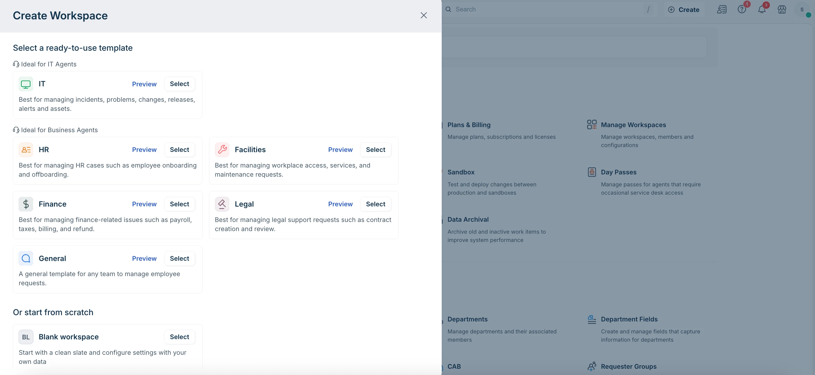 - Pick your blueprint: Select Create Workspace and browse our ready-to-use templates (such as Finance, HR, Facilities). Use the Preview option to see which one fits best.