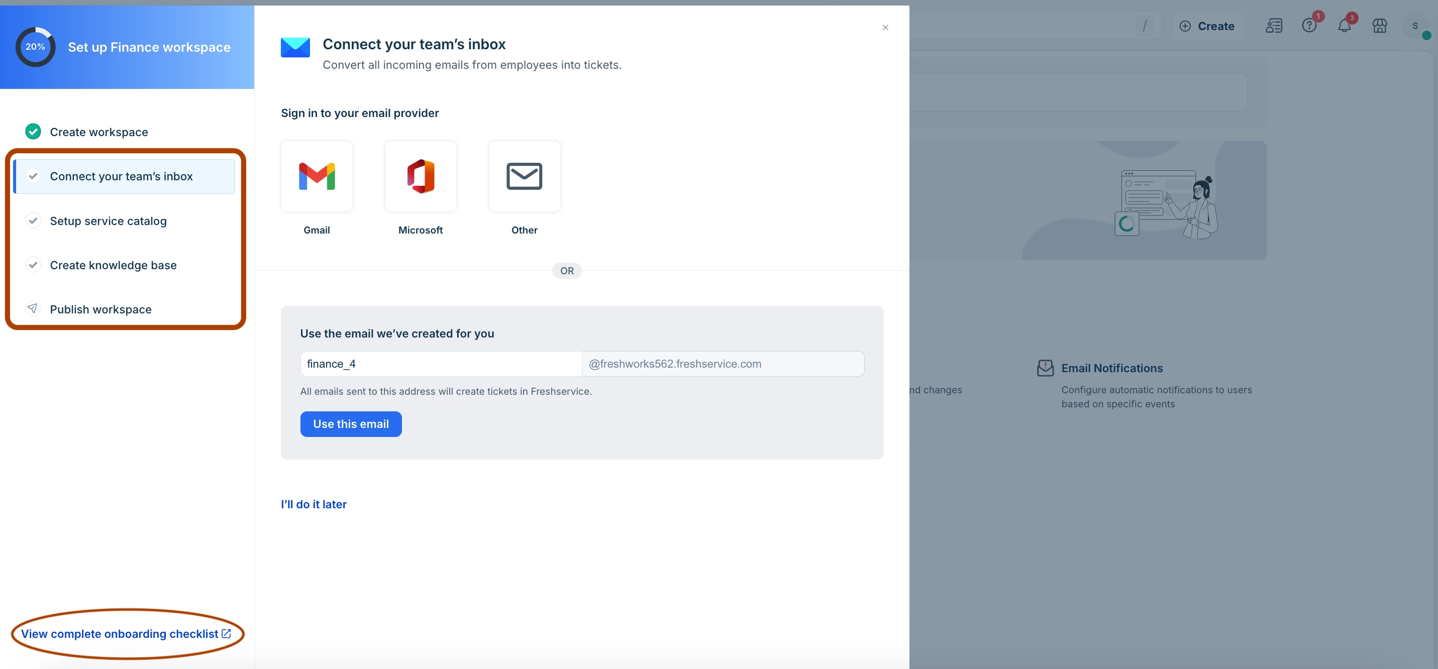 Pro tip: Keep the "Create sample data" toggle ON–the best way to explore how the workspace functions without having to build everything from scratch. - The "Let's go" moment: Once created, enter the Setup Mode, and connect your team’s Inbox, build your Service Catalog, and populate your Knowledge Base.