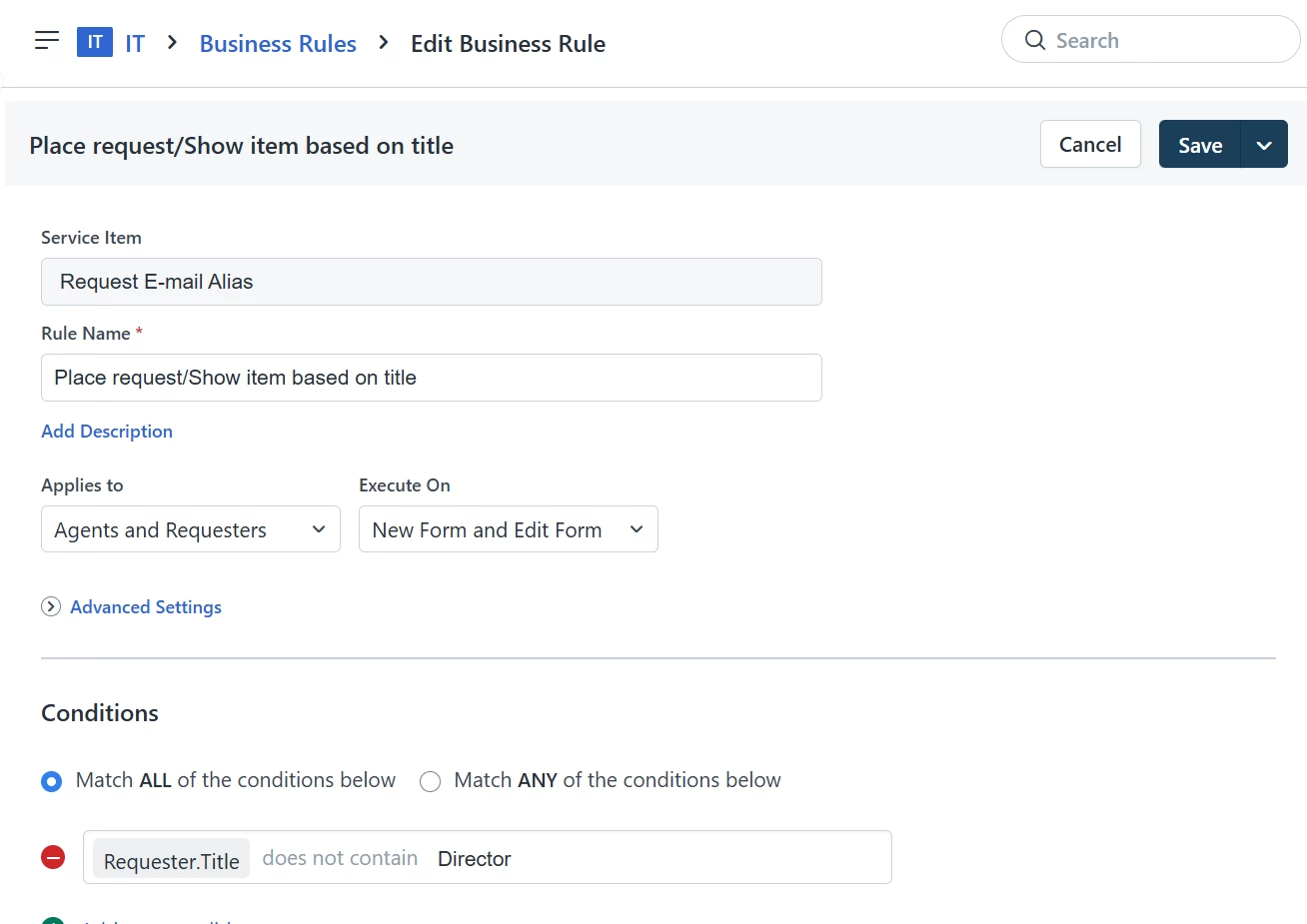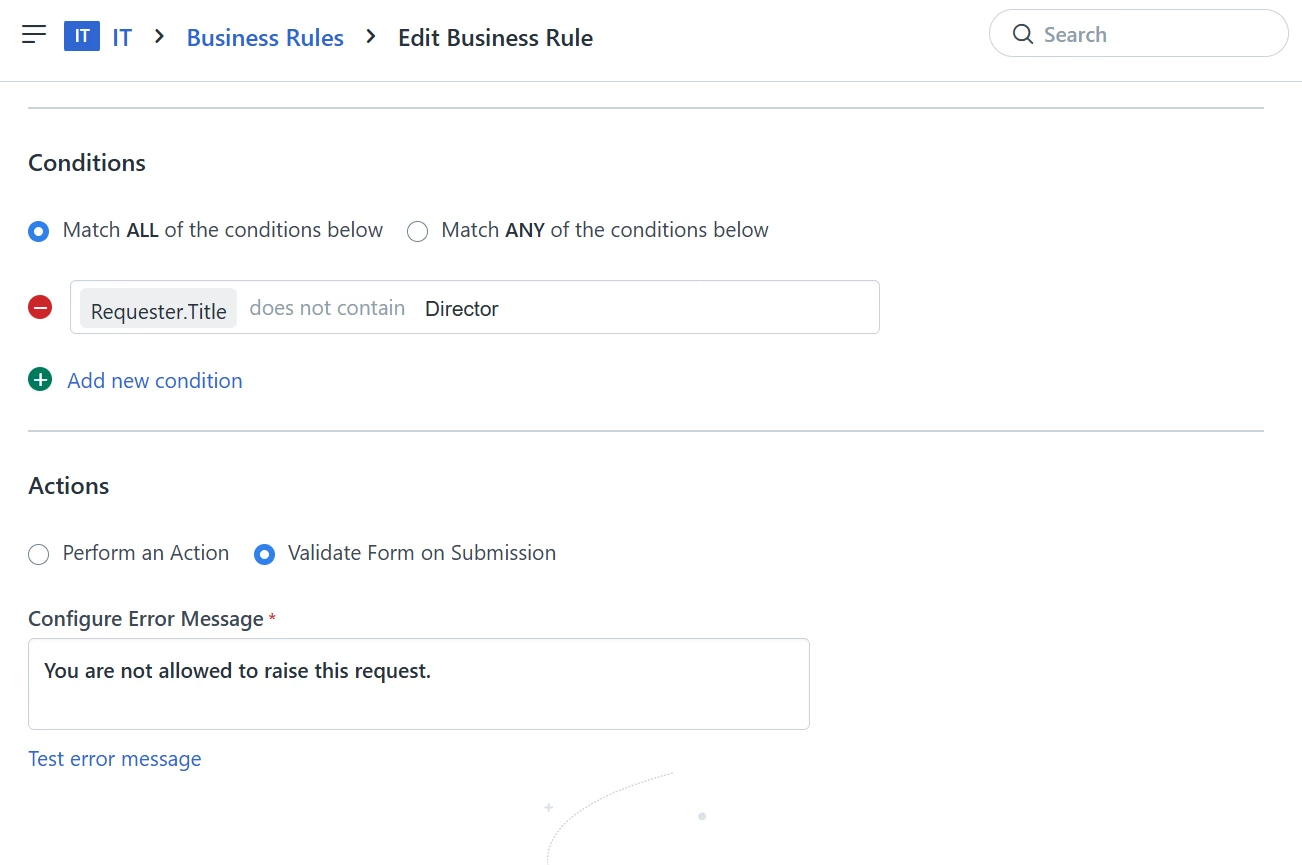 So this rule will not allow a requester/agent to raise a specific service item if their title does not contain the word “Director”. You can configure it with required titles.