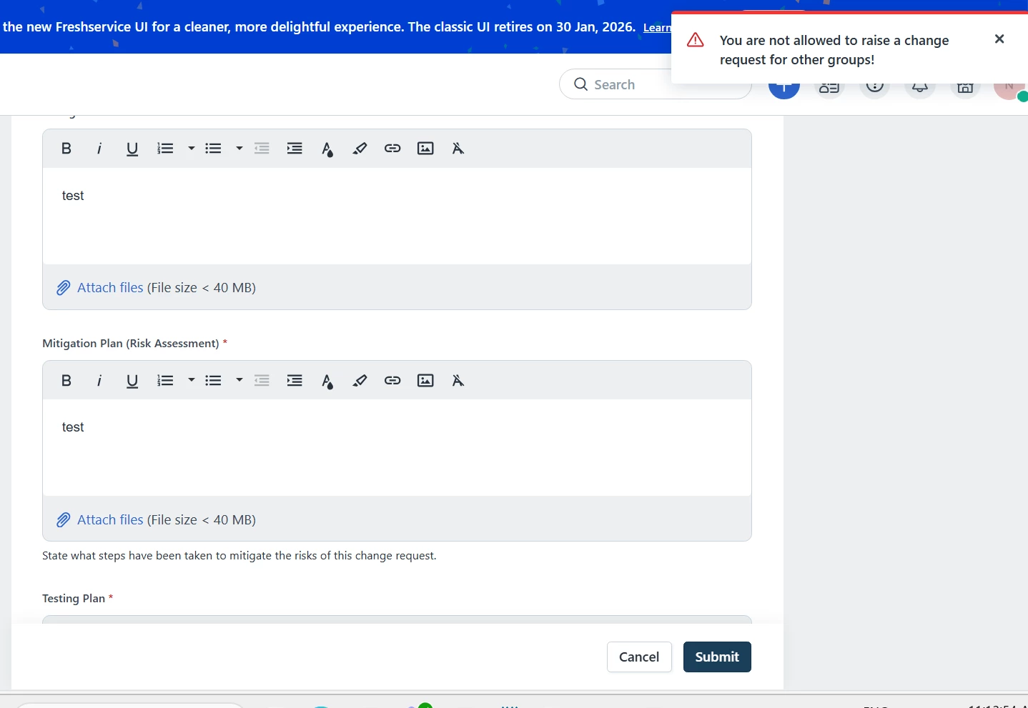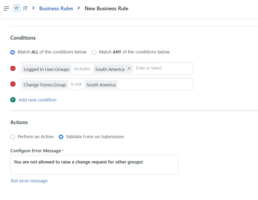 Click on “Validate form on submission” and then enter the error message. This will ensure that if the agent from South America group tries to raise a change request for some other group, say “North America”, it will throw the error “You are not allowed to raise a change request for other groups!” and that change request cannot be submitted.