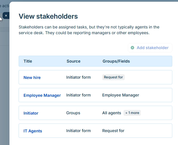 In our use case, agents perform key activities—for example, the IT team creating a user’s email address or the HR team creating an employee ID.  While there is an option to add a stakeholder, the dropdown consistently shows “No options available.” Is this expected behavior, or could this be a bug?