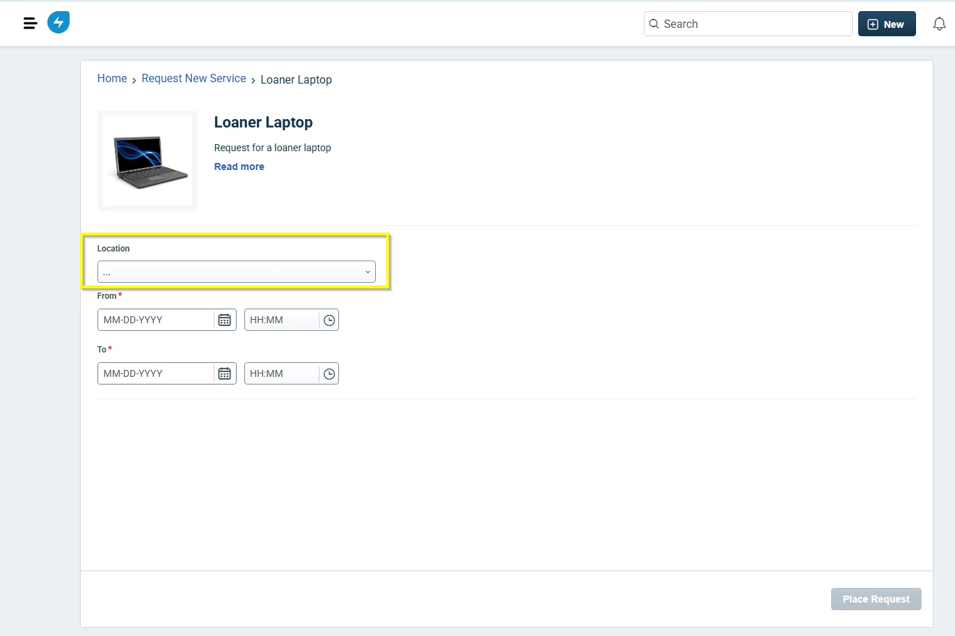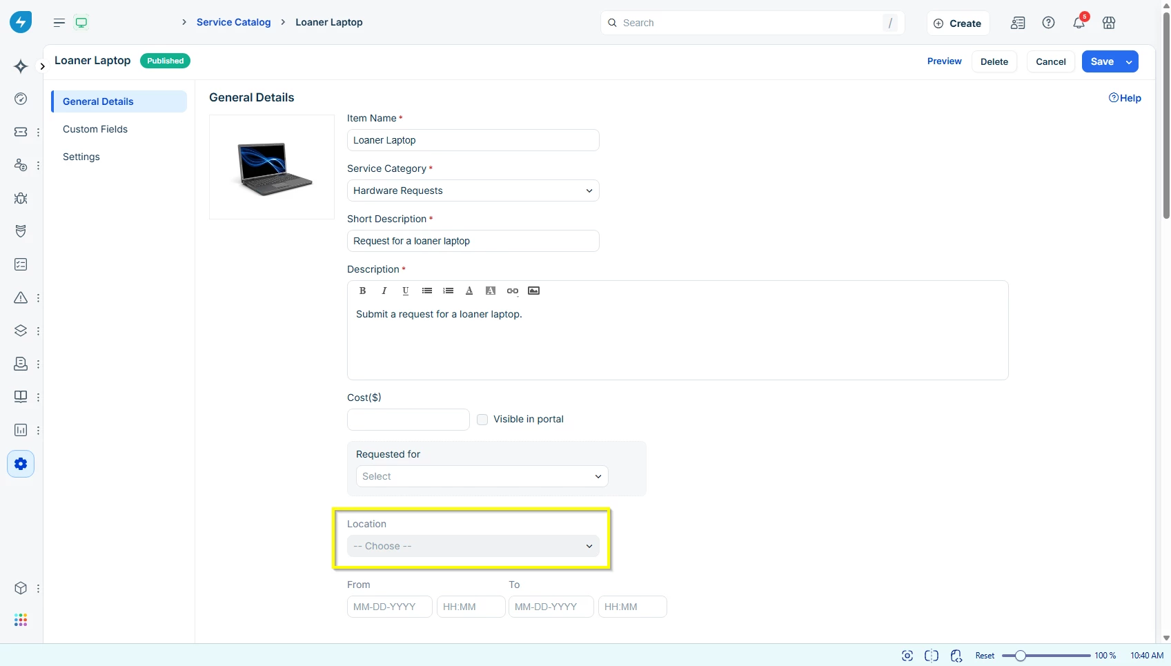 I work at a fairly small company (about 100 employees) and I’m trying to come up with a better way for us to loan out laptops to our users. They’ll periodically need if they’re traveling or if we’re troubleshooting their current device. I’ve already created a service item and added the fields we want. However, I’m wondering if there’s any way to remove or hide the default “location” field.