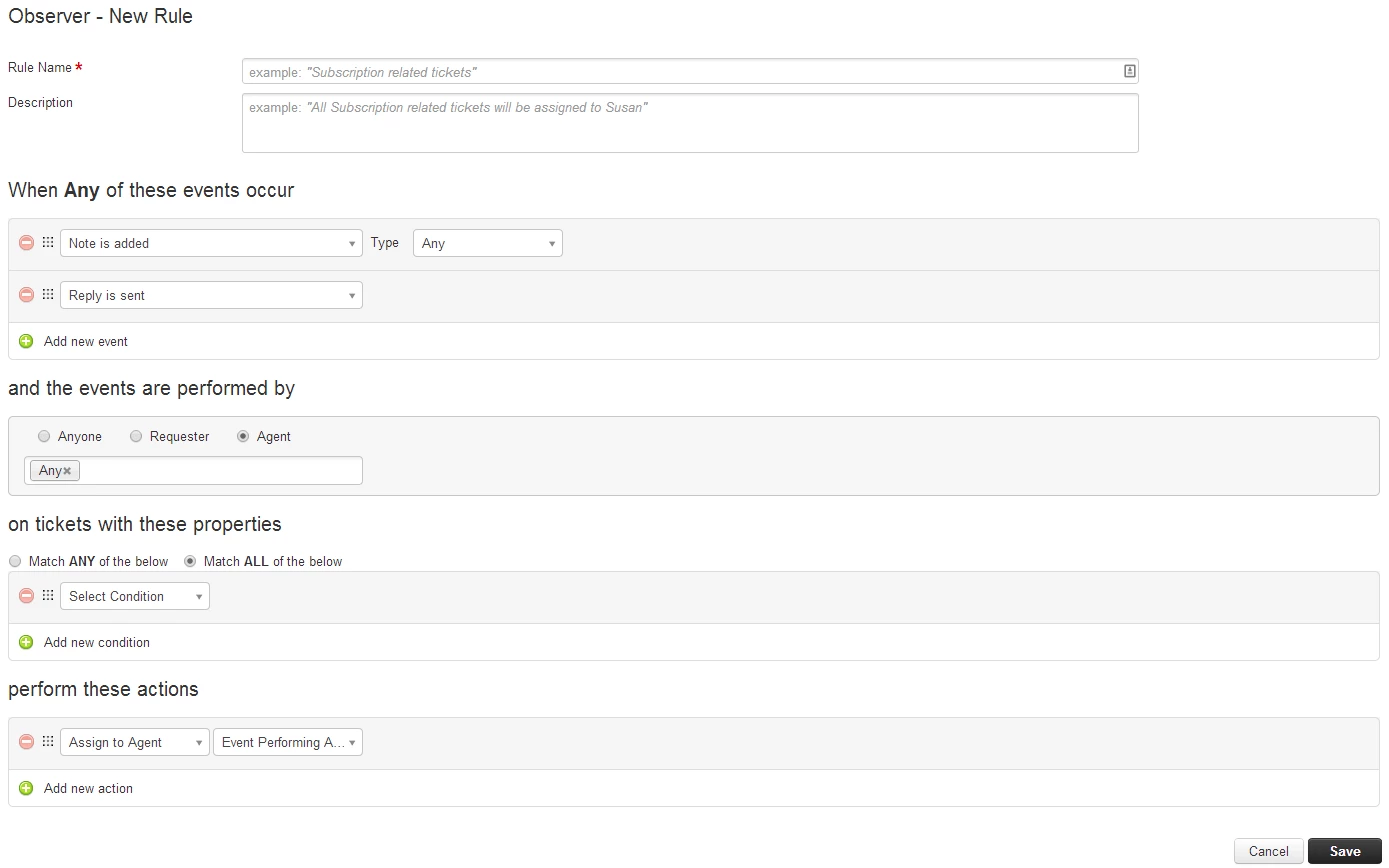 If an agent replies to a ticket that has no other agent attributed, Freshdesk will automatically assign the ticket to the replying agent. This has been taken care by the default Observer rule (Observer rules can be triggered to run on updates made to a ticket) "Automatically assign tickets to the first responder". This rule will be available by default for all accounts.