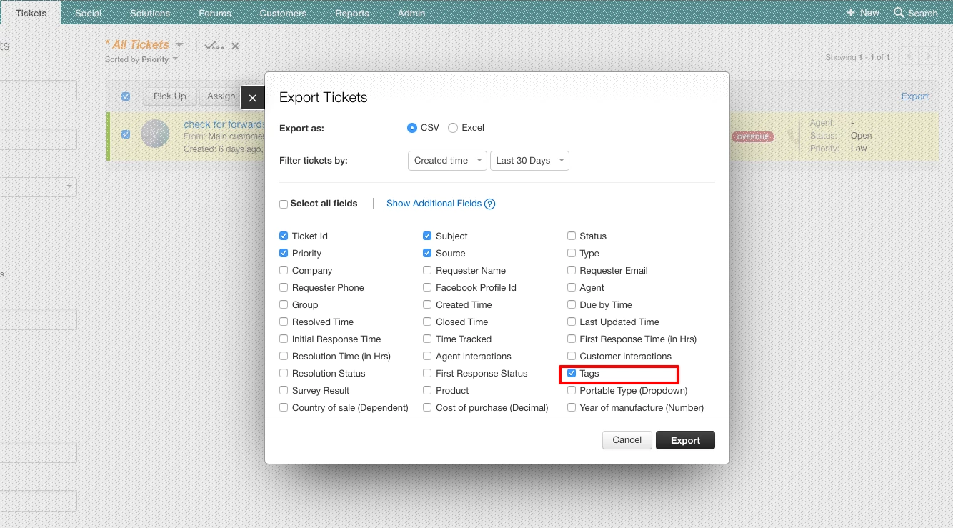 I feel that is would be ideal to have Tags included as an option when we export tickets as a csv file.