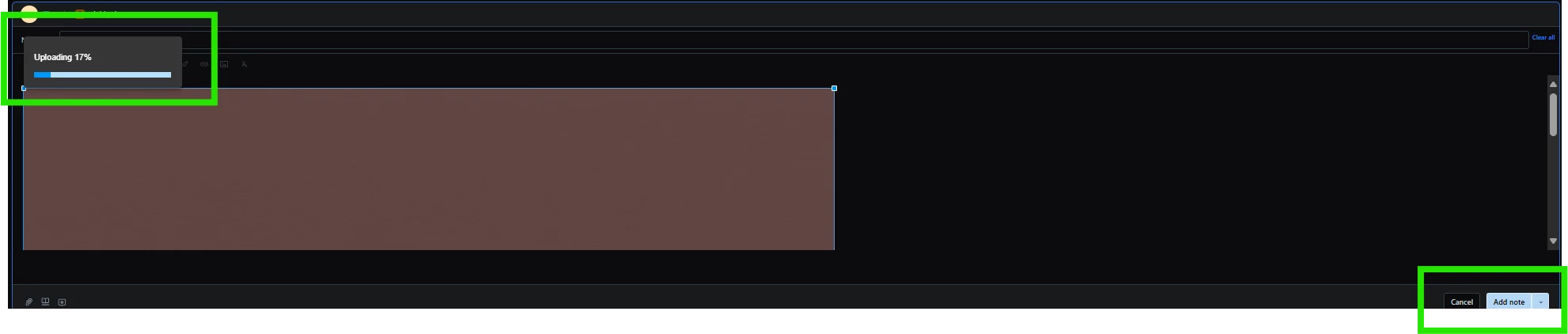 When we create a note and want to upload an image to it, the “Add Note” button does not get blocked. This causes the image to be removed if we click the button before the upload is completed. My suggestion is either to disable the “Add Note” button until the image finishes uploading, or to queue the actions in Fresh so that images upload first and only then the system adds the note.