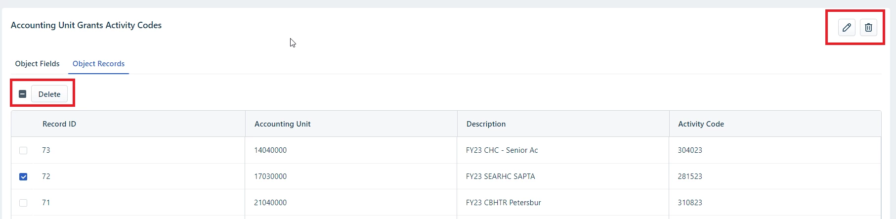 When editing individual custom object entries, to remove an entry the delete button is in the upper left. However, the delete icon to delete the entire custom object list is also on the page, in the upper right.