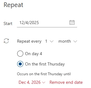 Most of our maintenance windows are planned for something like “Every 2nd Tuesday of the month”. There is no way to accommodate this in the current system other than to manually schedule ever maintenance window. This is cumbersome and difficult to manage consistently. Looking for something more like the below. While we’re at it, please make it possible to schedule the pattern for at least 1 year at a time.