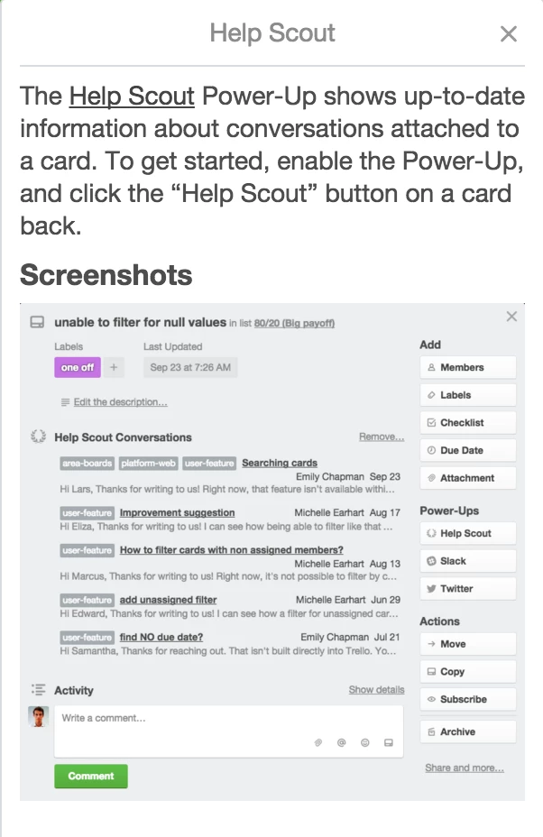 the HelpScout "PowerUp" in Trello also updates the Trello card with information: