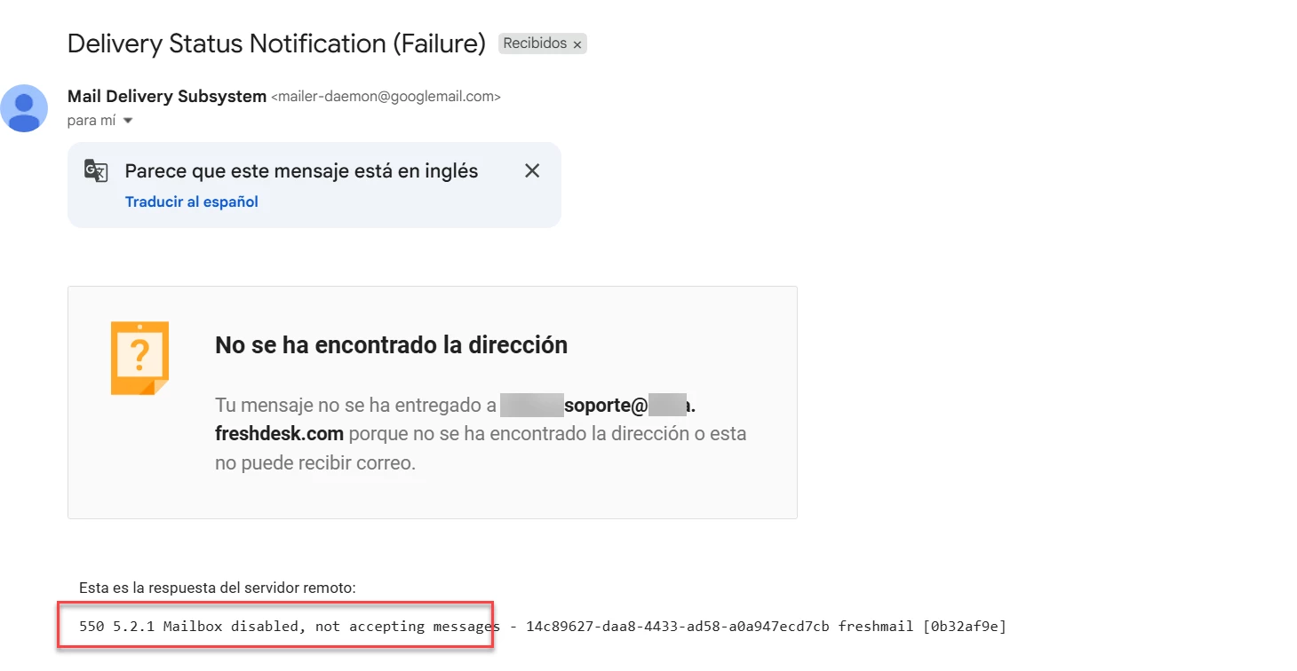 | Esta es la respuesta del servidor remoto: 550 5.2.1 Mailbox disabled, not accepting messages - 14c89627-daa8-4433-ad58-a0a947ecd7cb freshmail [0b32af9e]