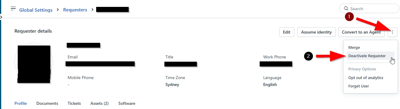 You can deactivate the Requester by opening their profile, click on the ellipses far right and select Deactivate Requester.