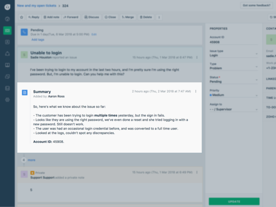 so that instead of going through 50 different converstations we can simply put the resolution in, so when you look back at a ticket you can simply open it up and see how you resolved a certain ticket.